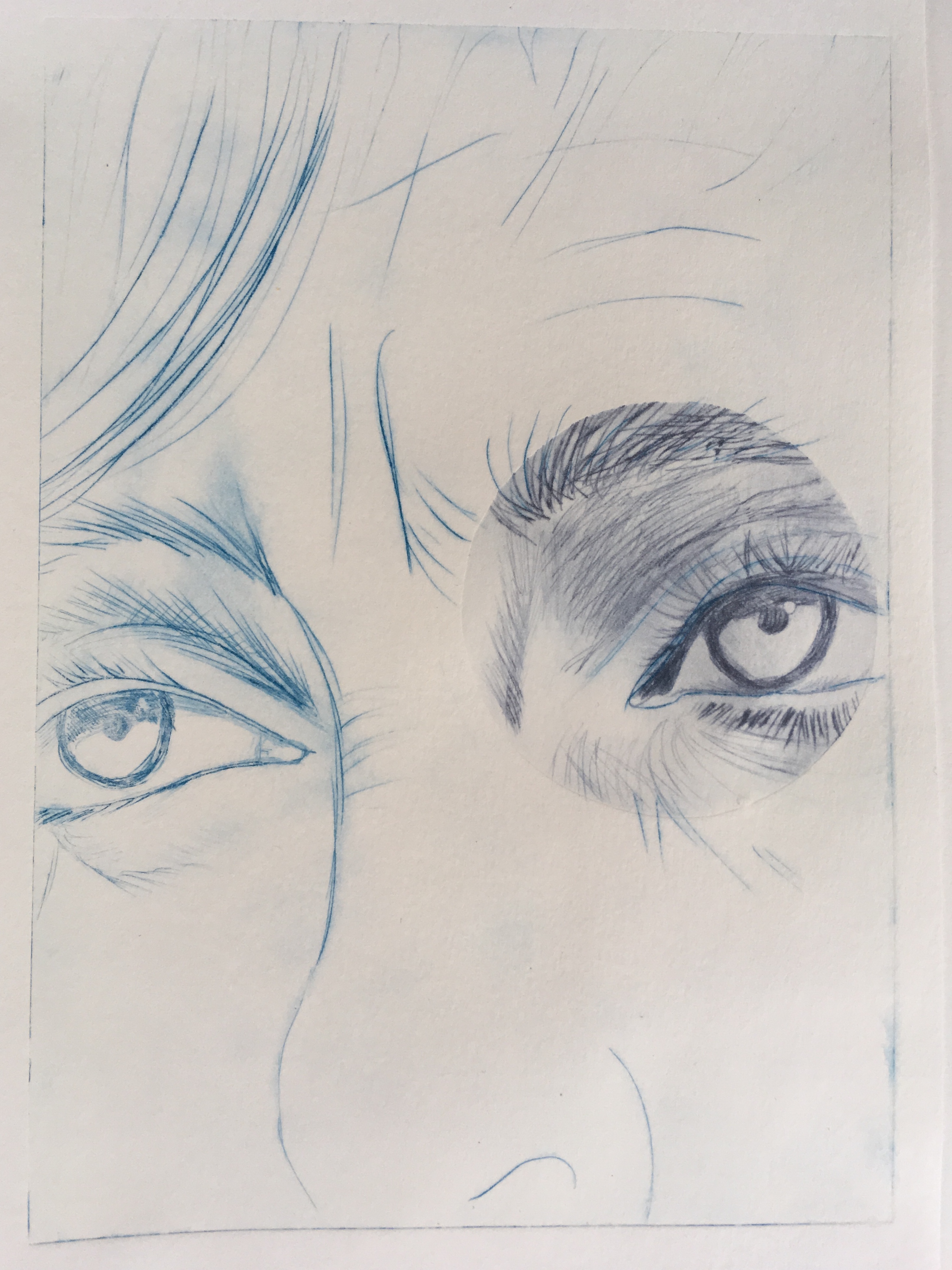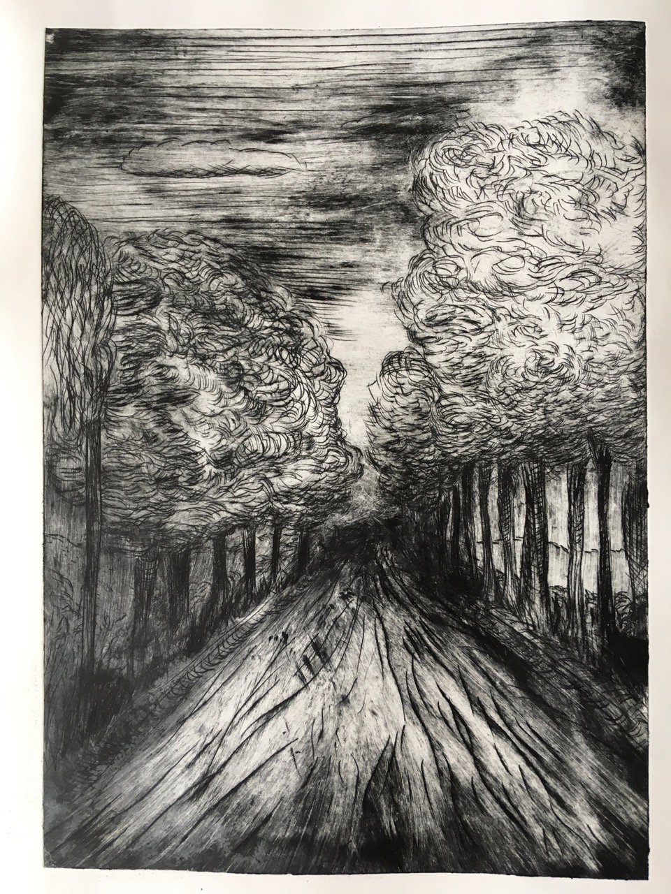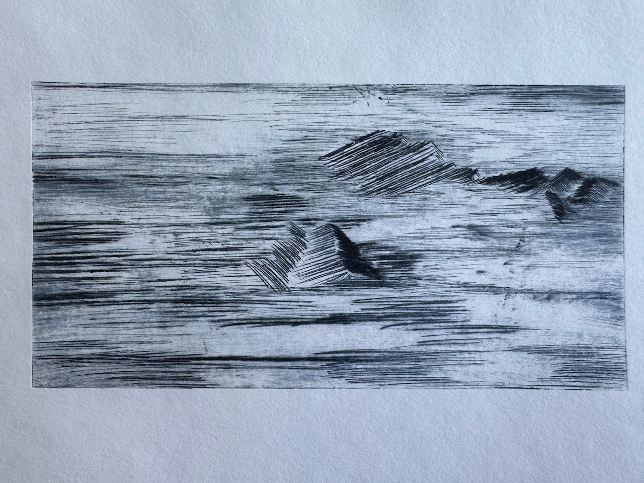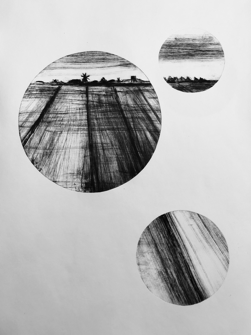 Etsen staat dicht bij tekenen; toch geeft de mogelijkheid om tijdens het drukproces te spelen met toon en kleur het een geheel nieuwe dimensie. Recent ben ik begonnen met experimenteren met lagen en het verkennen van manieren om andere technieken te combineren met het etsen.