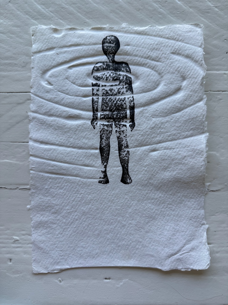 Reflection, a mixed media work that combines embossing and linocut, explores what we see and what we don’t. Personal reflection provides an opportunity to take a look and observe what we see. We cannot see everything and another can only see so much. This works explores the process of reflection. The literal reflection (mirrored surfaces or water) does not reveal the metaphorical (self-reflection or memory) depths of reflection. Reflections alter perception, sometimes revealing hidden areas.