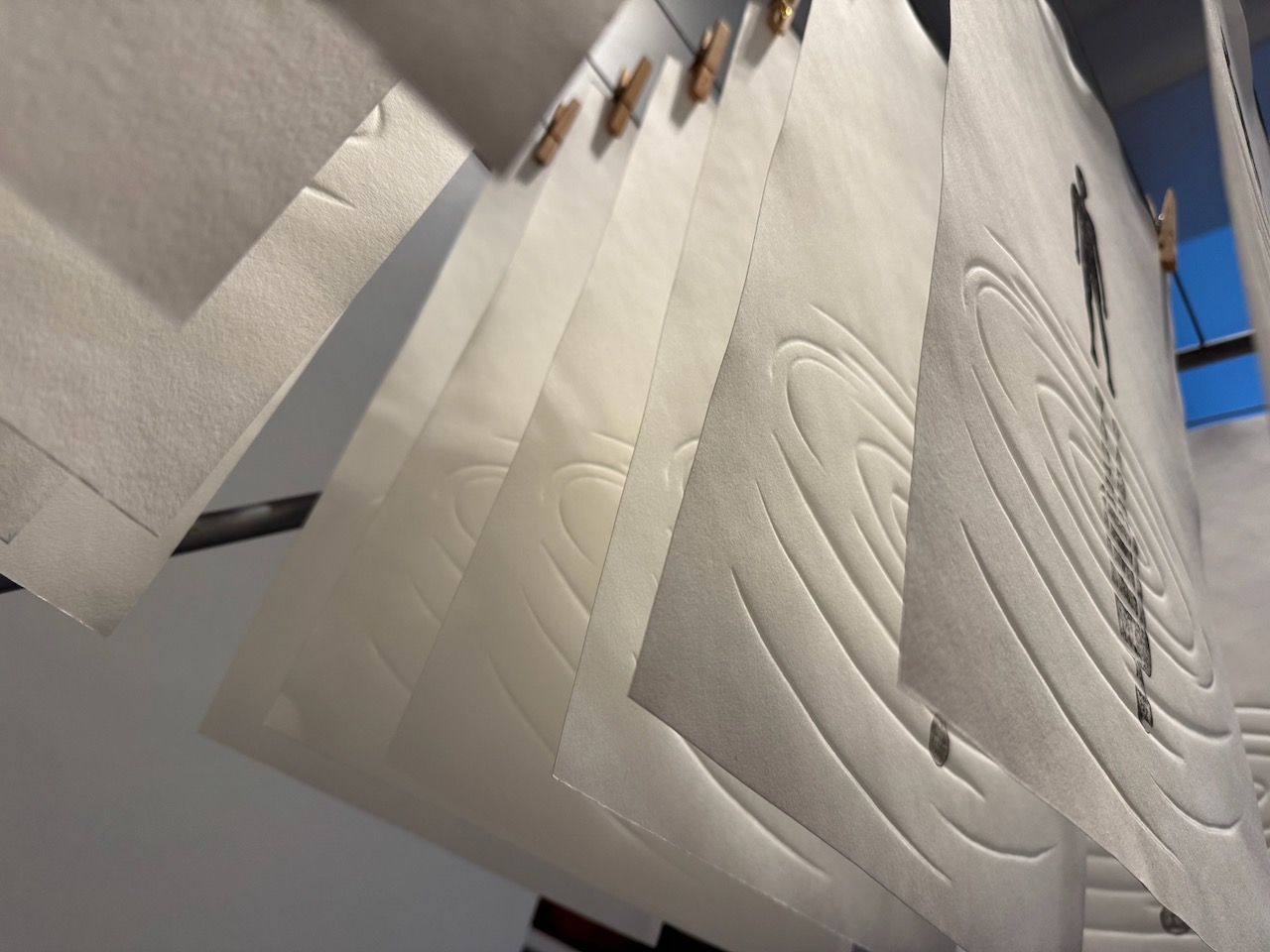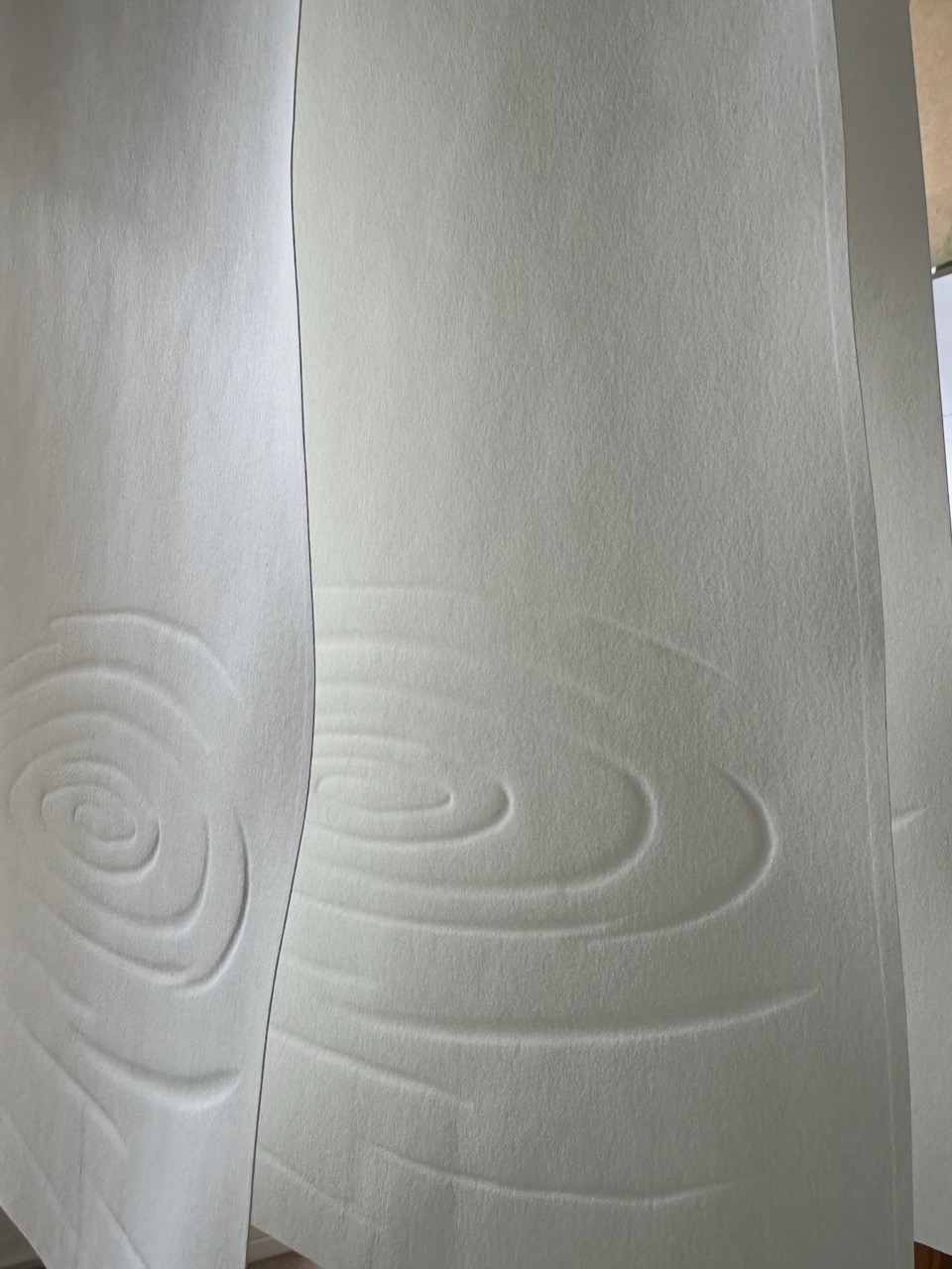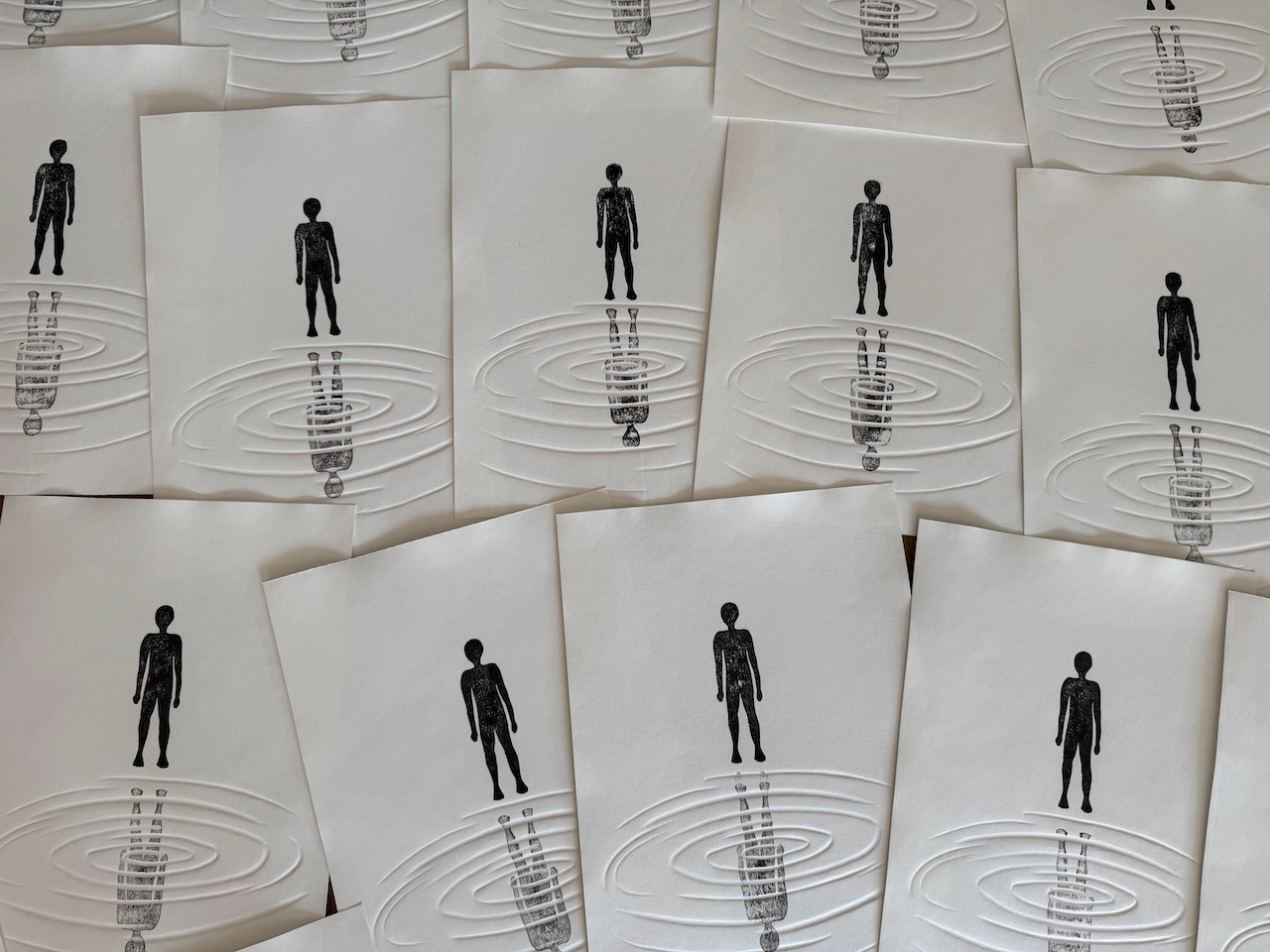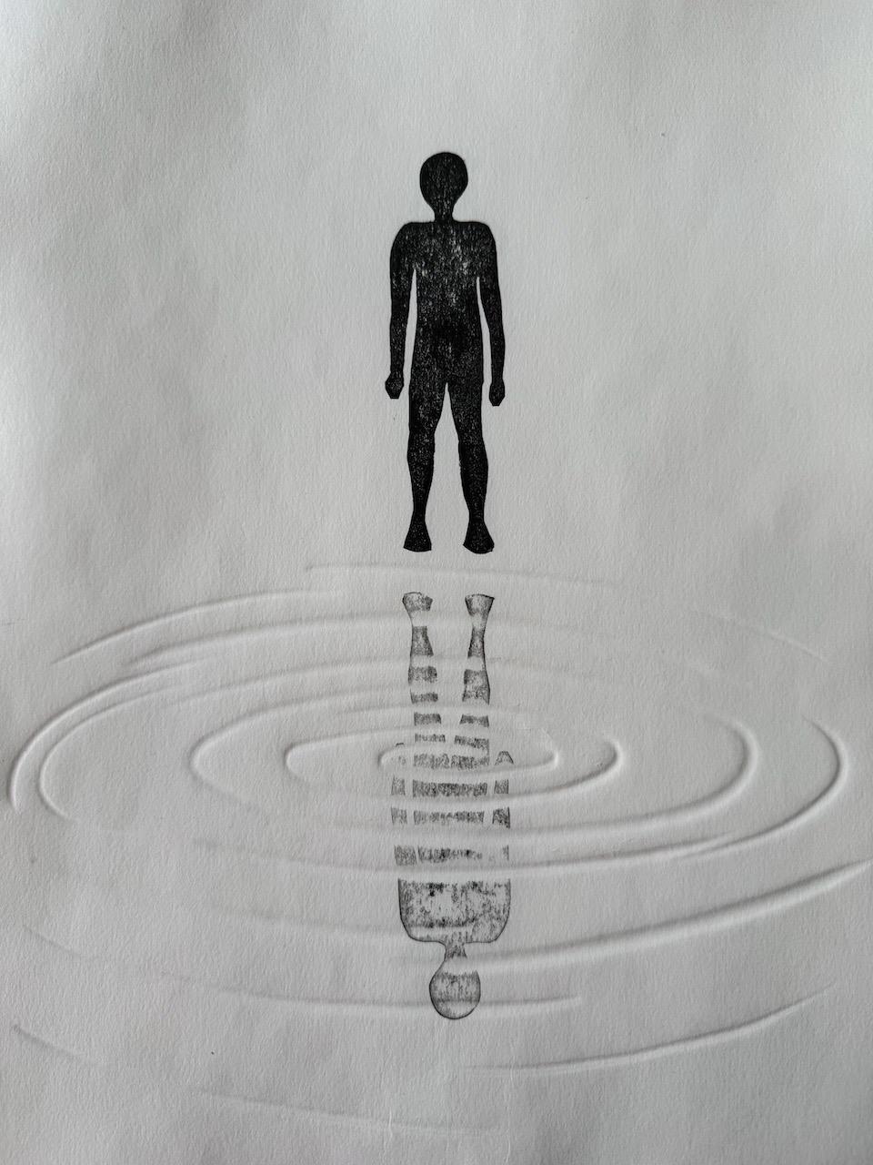 Reflectie, een werk dat blinddruk en lino combineert, onderzoekt wat we wél zien en wat we níét zien. Persoonlijke reflectie biedt de mogelijkheid om waar te nemen en te observeren wat er zichtbaar wordt. We kunnen nooit alles zien, en ook een ander ziet slechts een deel. Dit werk verkent het proces van reflectie. De letterlijke reflectie (zoals in spiegelende oppervlakken of water) onthult niet de metaforische (zelfreflectie of herinnering) diepten van reflectie. Reflecties veranderen onze waarneming en onthullen soms verborgen lagen.