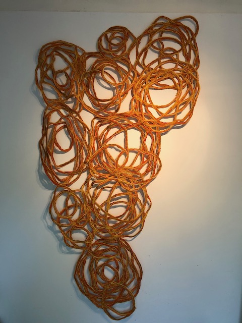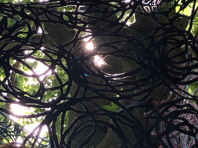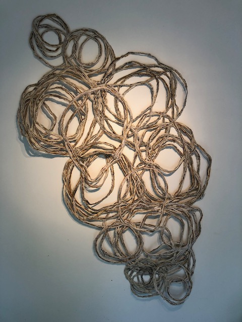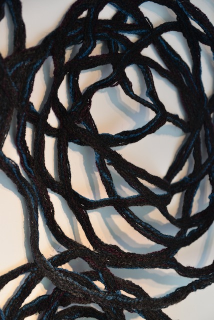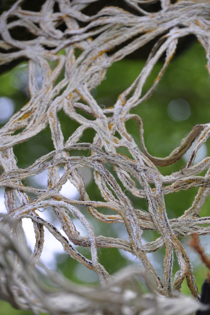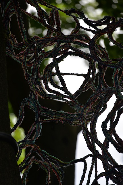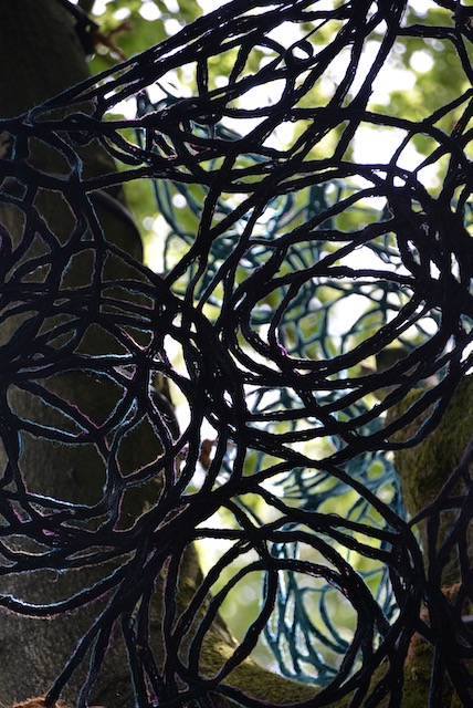Als beeldend Kunstenaar werk ik met verschillende media waaronder textiel en garen. Zowel organische vormen als ambachtelijke textiel vormde inspiratie voor dit werk. De open vormen die ontstaan bij het maken van kant of haakwerken hebben overeenkomsten met de patronen die de overlappende takken van bomen vormen.