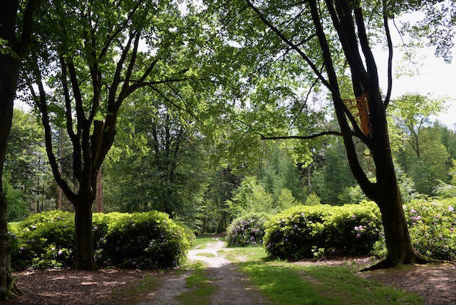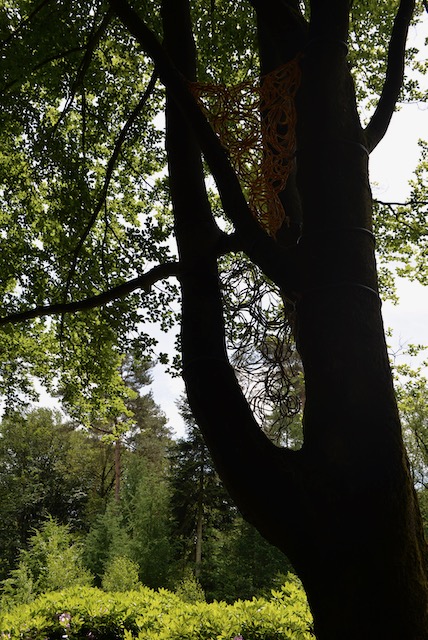 The trees in the Sterrenbos of Hof Espelo in the region of Twente in the Netherlands were once carefully chosen because of the view that their tops would create in alle seasons of the year. These beautiful natural patterns are celebrated in the textile artwork that I have made to measure for these trees. Two trees on both sides of the central path have been chosen close to the centre of the Sterrebos where the textile pieces now hang.