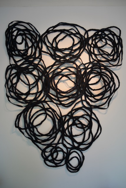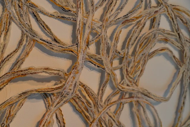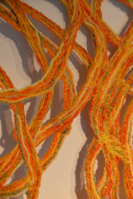 As a visual artist I work with many different media including textiles and thread. Both organic shapes and the heritage of the textile industry formed the inspriration of this work. The open forms that are created when lace is made has similarity tot the patterns formed bij overlapping brances of trees.