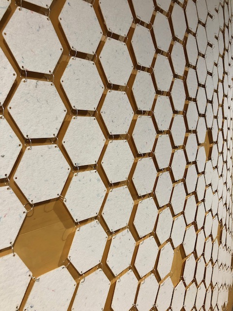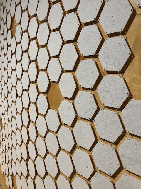 The worldwide corona pandemic has hit many counties severely. In The Netherlands it hit both society and the care services hard. It presented many challenges in both a negative but als positive way. We lost patients and at the same time there was room for growth. The artwork is a memorial to all of the efforts made by the employees of the Tjongerschans Hospital, who worked together to provide the best care for every patient. The work symbolises the warmth and drive with which individuals came together. The work uses the hexagon from the Tjongerschans logo, current at the time of the pandemic. Inspired by nature it is a reference to building blocks that unite. The vilt with which they are made is 100% recycled worn uniforms of care workers.