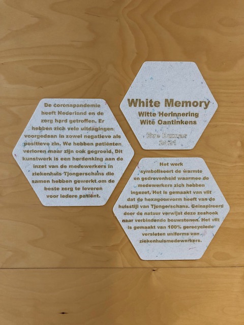 De coronapandemie heeft Nederland en de zorg hard getroffen. Er hebben zich vele uitdagingen voorgedaan in zowel negatieve als positieve zin. We hebben patiënten verloren maar zijn ook gegroeid. Dit kunstwerk is een herdenking aan de inzet van de medewerkers in ziekenhuis Tjongerschans die samen hebben gewerkt om de beste zorg te leveren voor iedere patiënt. Het werk symboliseert de warmte en gedrevenheid waarmee de medewerkers zich hebben ingezet. Het is gemaakt van vilt dat de hexagoonvorm heeft van de huisstijl die ziekenhuis Tjongerschans hanteerde ten tijden van de pandemie. Geïnspireerd door de natuur verwijst deze zeshoek naar verbindende bouwstenen. Het vilt is gemaakt van 100% gerecyclede versleten uniformen van ziekenhuismedewerkers.
